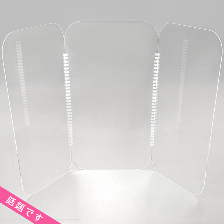 リングで閉じたアクリル製のポータブルシールド。新しい生活様式に即して専用バッグで携帯します。