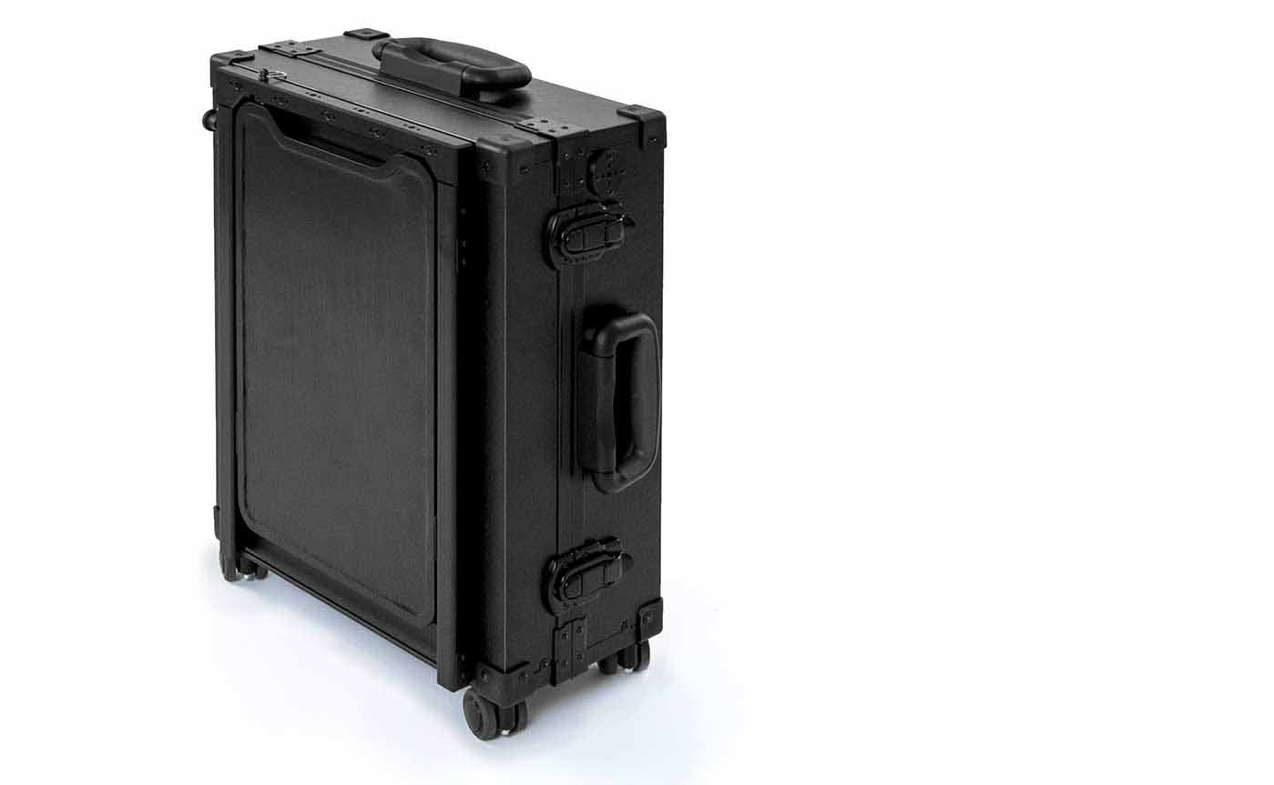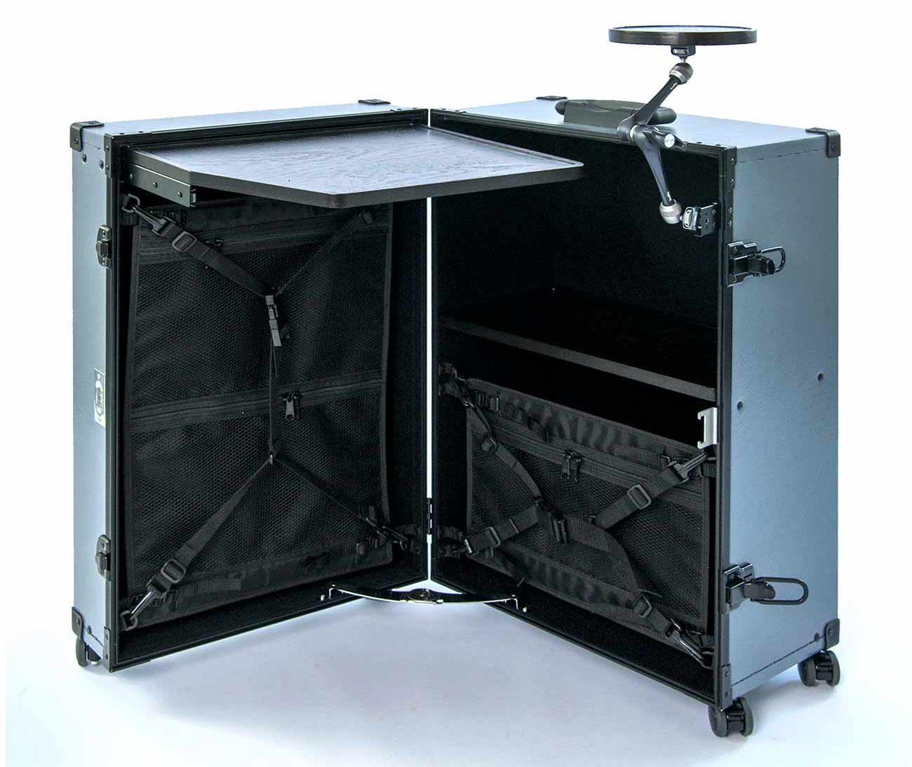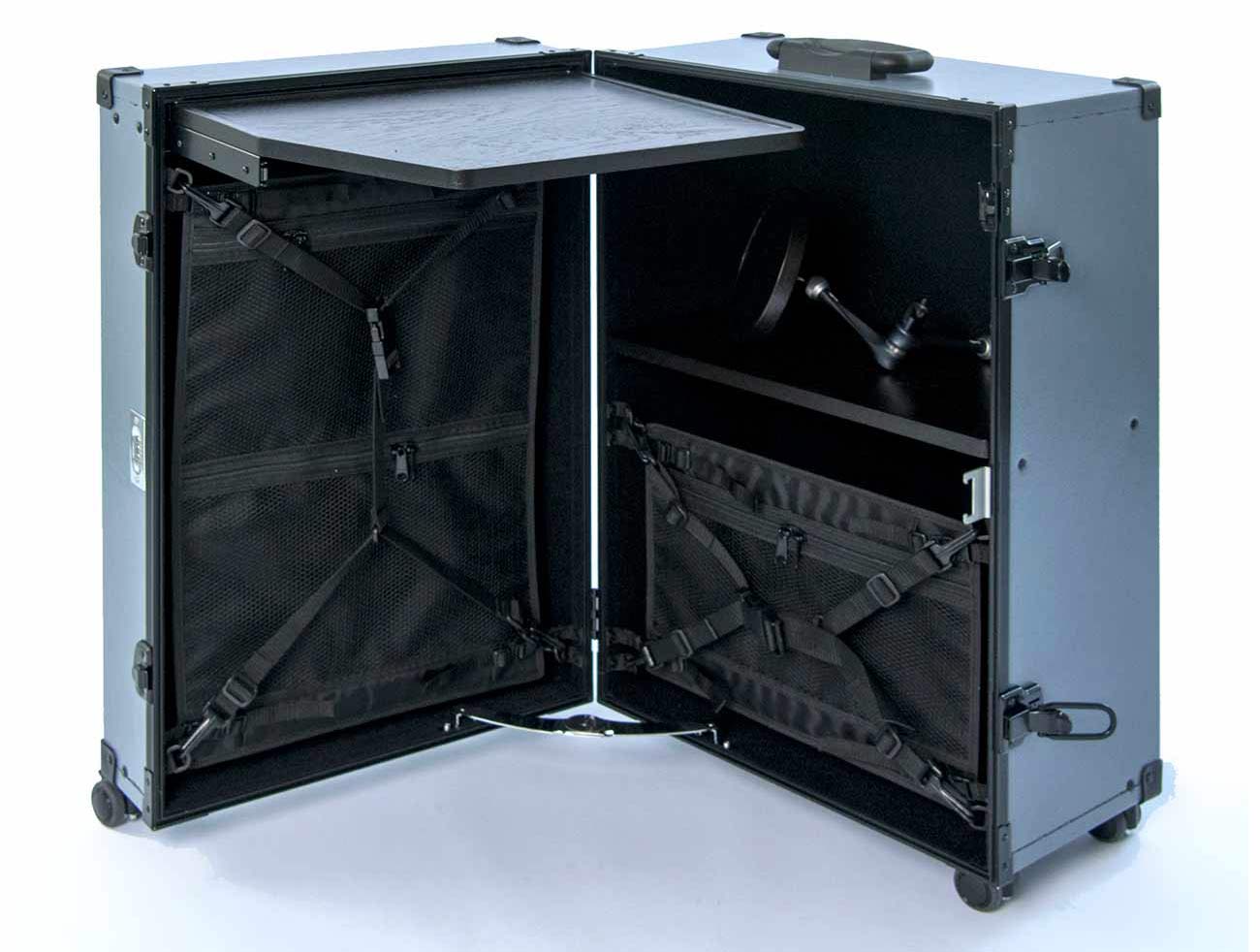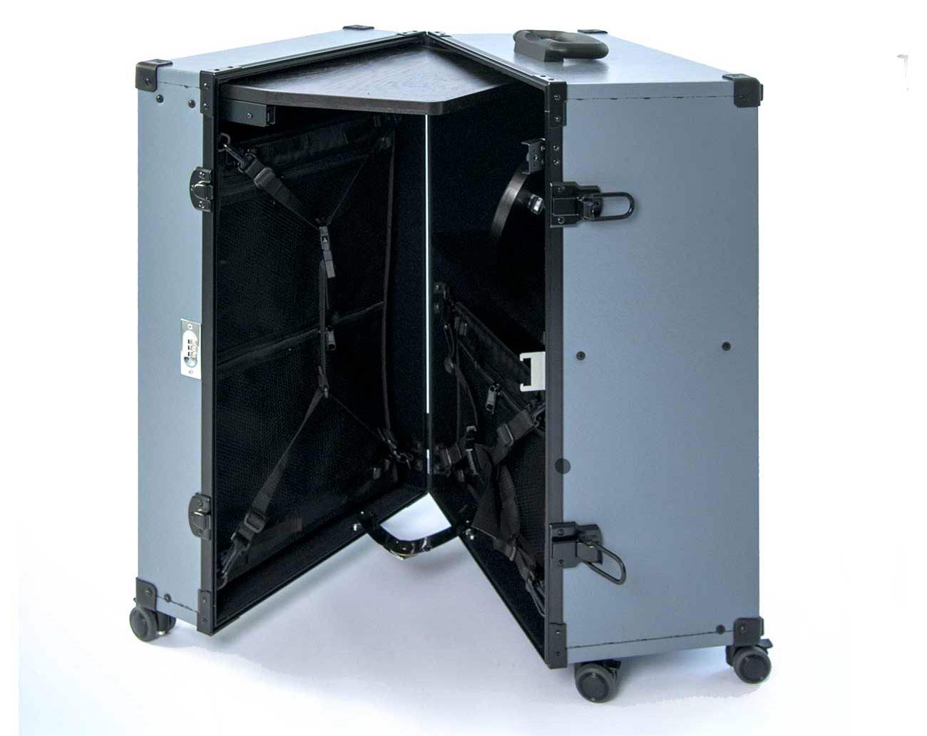 かばんの3辺の合計が158cmまでは多くのエアラインで一般的な預け入れ手荷物のサイズです。 左右に100度まで開き、安定した作業スペースを確保します。スーツケース内のヒンジにマジックアームを装着できます。