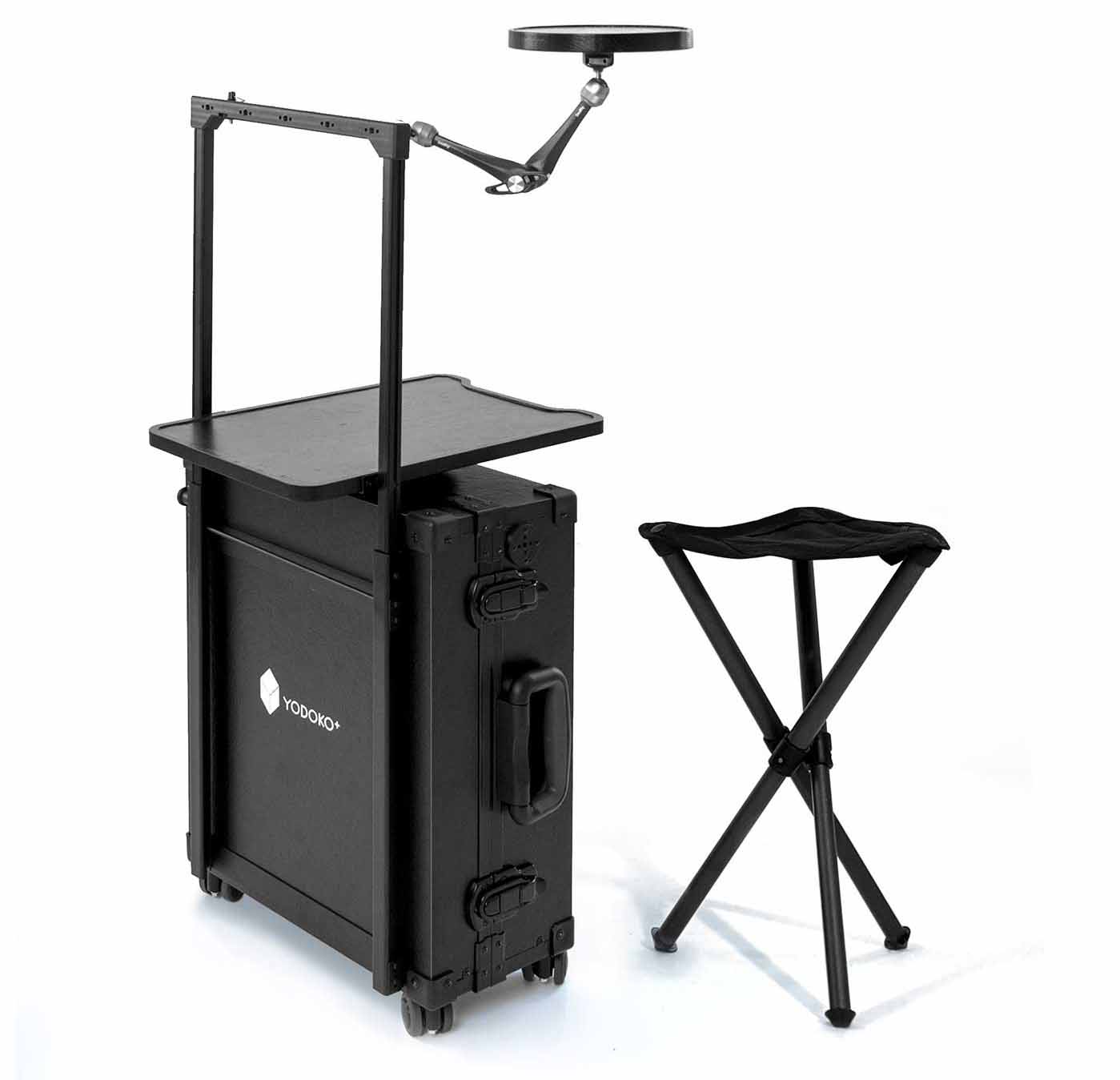 かばんを広げ、スツールを取り出せばそこはワークステーションです。デスクにノートパソコンや飲み物を置き、付属のマジックアームと小テーブル、スマートフォンホルダーをセットすると、移動先のオンライン会議やライブ配信の拠点になります。